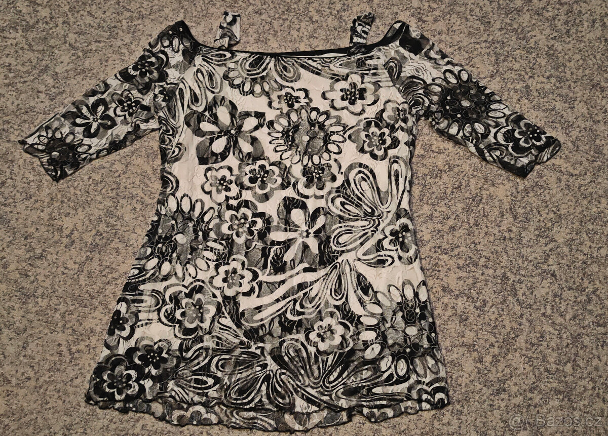 Společenská černá halenka, vel. M-L - [27.12. 2025]Kombinace lehkého splývavého materiálu s krajkovými 3/4 rukávy a krajkovou zvonovou vsadkou v zadním díle. Přední díl kulatý dekolt, zadní do špičky. Délka halenky 70 cm, velice slušivá.