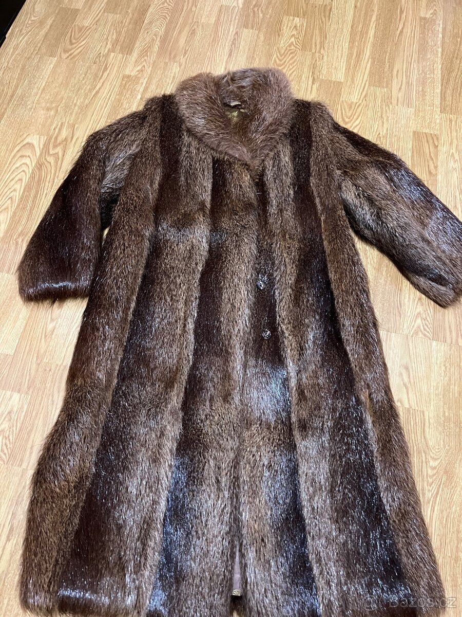 Délka pod kolena , velikost 38-40, delka od ramen dolu 112 cm, obvod hrudníku min 120 cm - knoflíky se daji posunout. Pěkné zpracovani, vzadu a u rukavu se kožešina odchlipuje (nafoceno) krasna podšivka. Nevyužite dědictvi