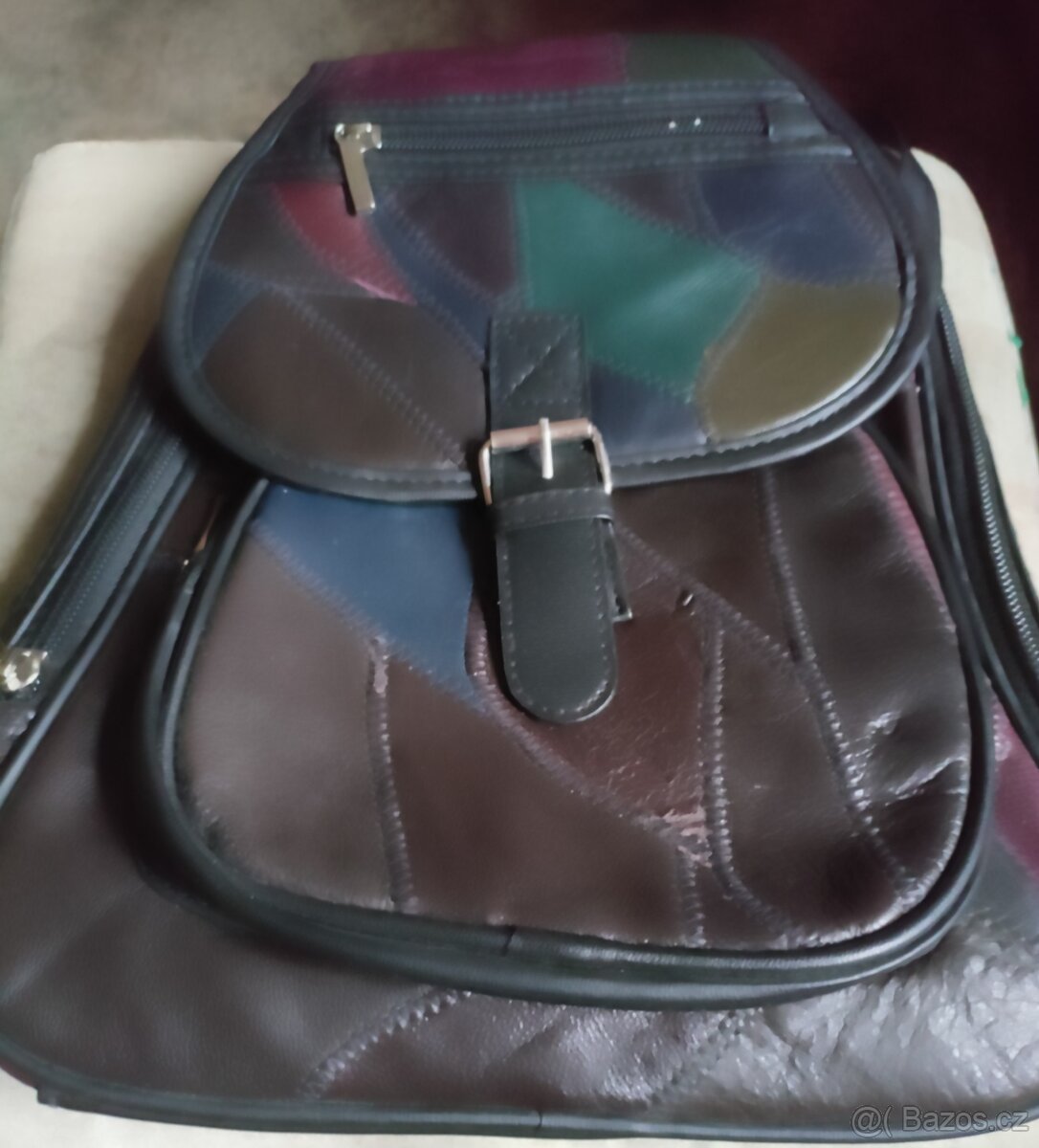 Lehký variabilní batoh z patchwork kůže černý s vínovou, tm.zelenou. Poutko do ruky nebo na zavěšení. Rozměr 25x31x9 cm.