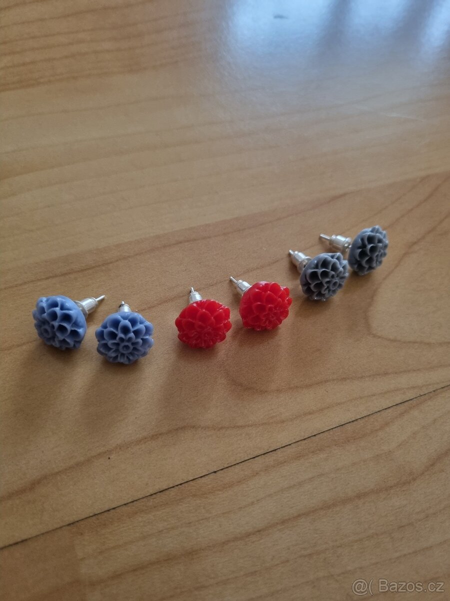 Set 3 párů kytičkových náušnic. Barva modrá, červená a šedá. Nové, zboží je doprodej z končícího e-shopu. Materiál: plast, bižuterní kov. Poštovné - osobní předání v Dolanech u Olomouce nebo v Olomouci - zdarma, Balíkovna 75 Kč, zásilkovna 89 Kč.
