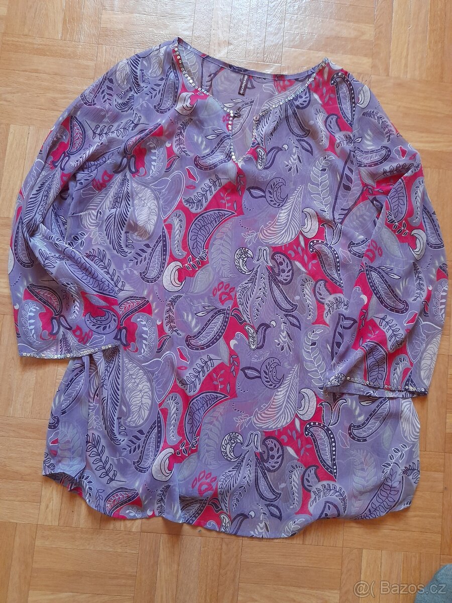 Dámská tunika - halenka Kim&co., vel. 52/54 - [29.12. 2025]Stav: velice pěkná. Míry: šířka přes prsa 69-79cm, šířka v pase 65-75cm, šířka spodního okraje 72cm, délka 70cm.