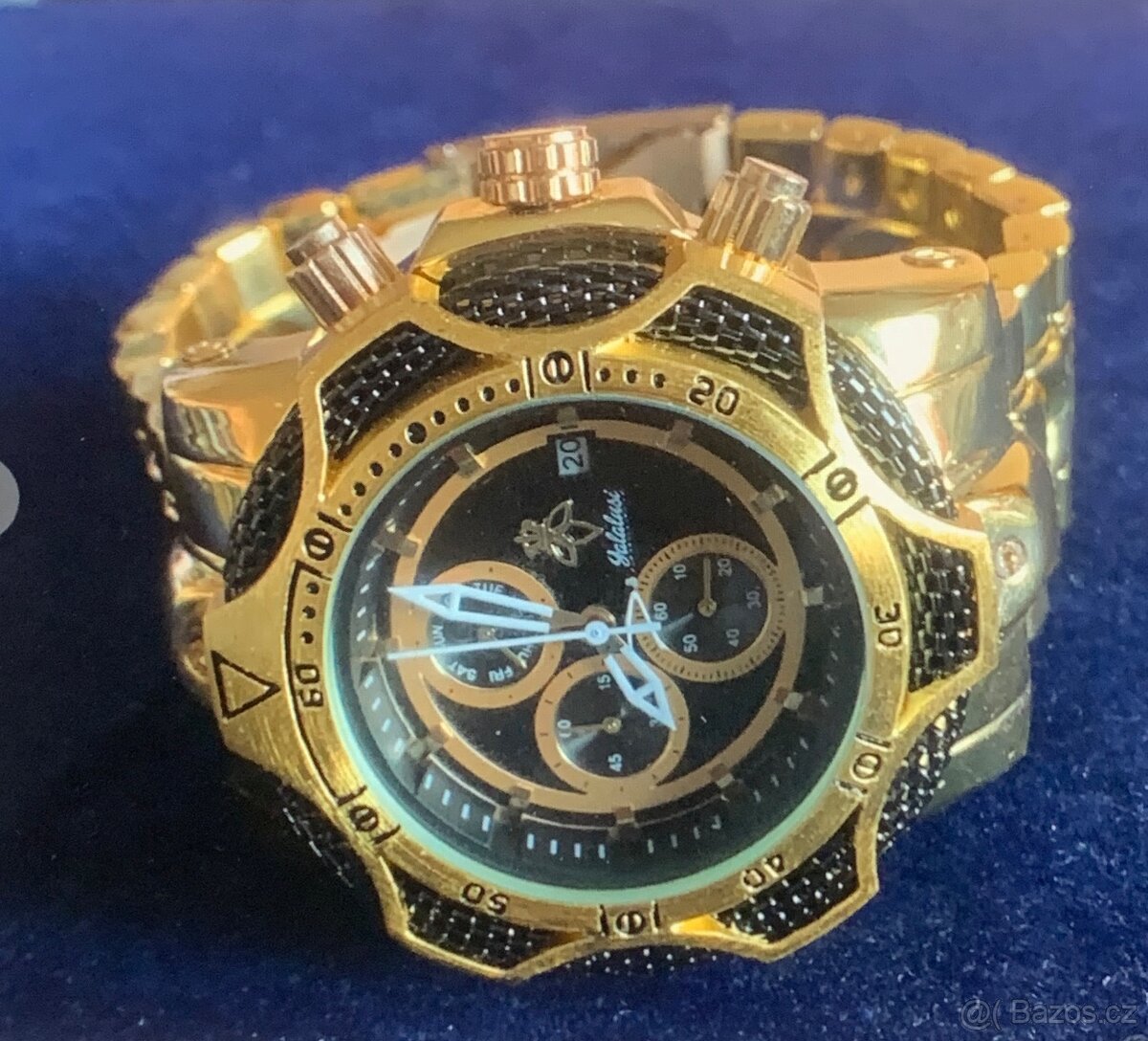 kvalitní chronography , datum , přesný čas , 24hodinový odečet , den v týdnu , centrální vteřinovka , masivní provedení, Japonský Quartz strojek , shodné s INVICTA VENOM , dno nerez , masivní tah s klopnou sponou s pojistkou ,, vše zlaceno 18K , minerální sklíčko , přidám nástroj na zkrácení tahu , krabička ,..nové