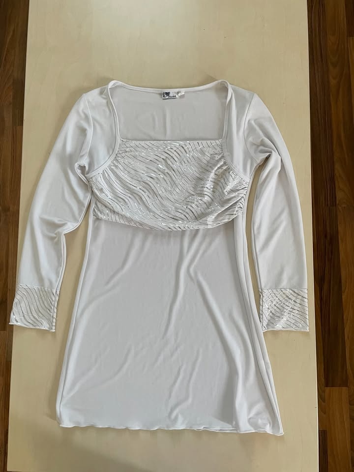 1433. nabízím k prodeji tento bílý top s řasením na hrudník a postříbřením v hrudníku a lemech rukávů, vel M, ale na volno i měné, Exclusive. Materiál 100% polyester. Nošené, bez vad, krásné