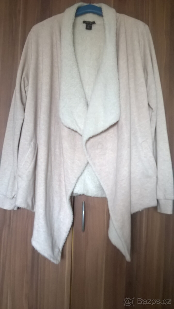 Prodám kabátek s asymetrickým předním dílem, široké klopy, podšitý, vel.XL -šířka zad 60cm, délka zad 68cm.