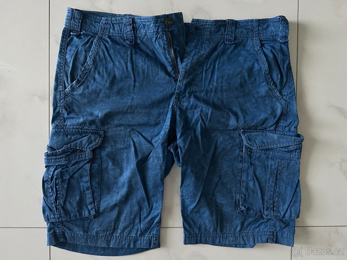 Prodám nošené bez vad pánské modré kapsáčové šortky / kraťasy Goods and Apparel. Vel. v pase 2x 50cm, vnější délka nohavice 56 cm, poklopec na zip. Cena 100 Kč.