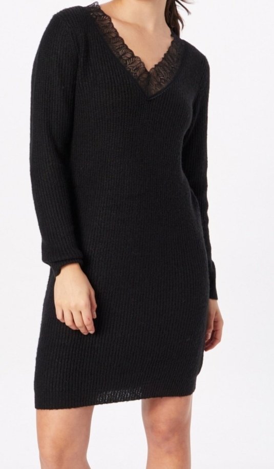 Pěkné pletené šaty značky Vila, černé s výstřihem do V zdobený krajkou, velikost S, volnější střih, nošené, běžné známky nošení