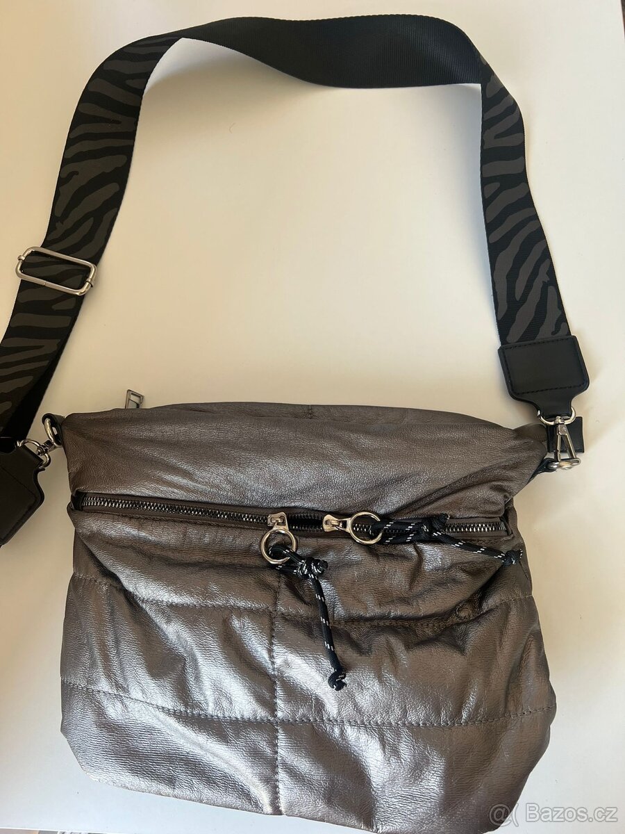 Dámská lehká textilní kabelka přes rameno zn. Jenny Fairy. Popruh lze odepnout, délka popruhu cca 124 cm, lze délku upravovat. Uvnitř černá podšívka , jedna kapsa na zip a dvě kapsy volně . Hlavní prostor kabelky je na zip. Kabelka má jednu velkou boční kapsu na kovový zip. Dobrý stav, cena 250,-Kč