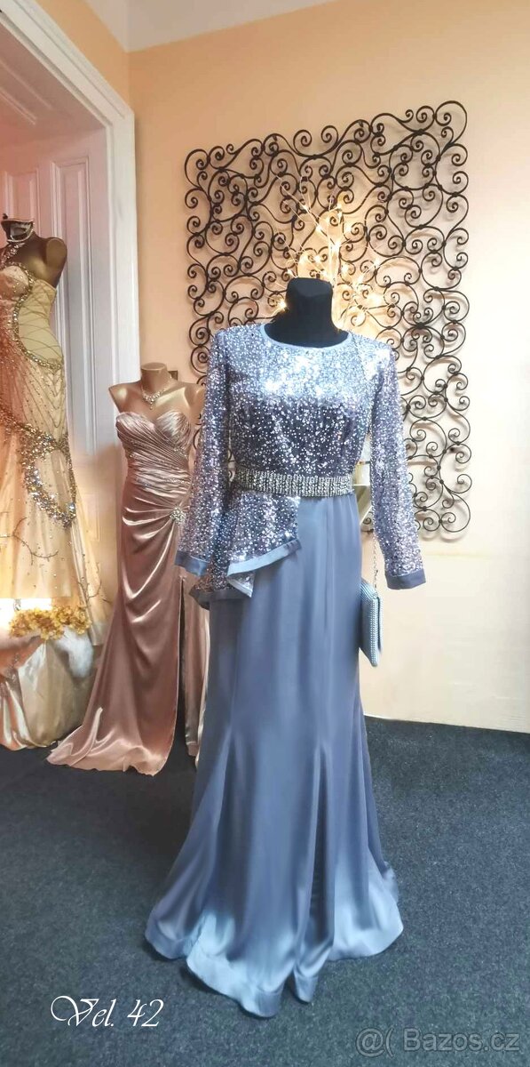 K prodeji pěkný model na zadní zip, BARVA ŠEDO-STŘÍBRNÁ dolní lem vyztužený, na sukni dole světlejší stín. Pásek není součástí, přidám kabelku. Rozměry -hrudník-104cm, pas-92cm, boky-110cm, celková délka-144cm