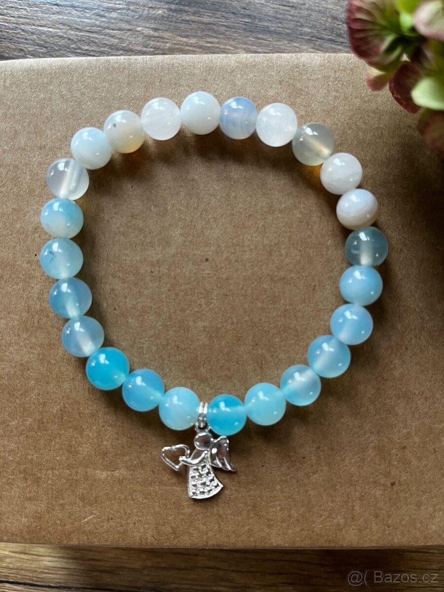 Náramek je vytvořen z korálků mátového pruhovaného achátu (průměr korálků 8mm), doplněný je stříbrným přívěskem ve tvaru anděla (Ag 925/1000).
