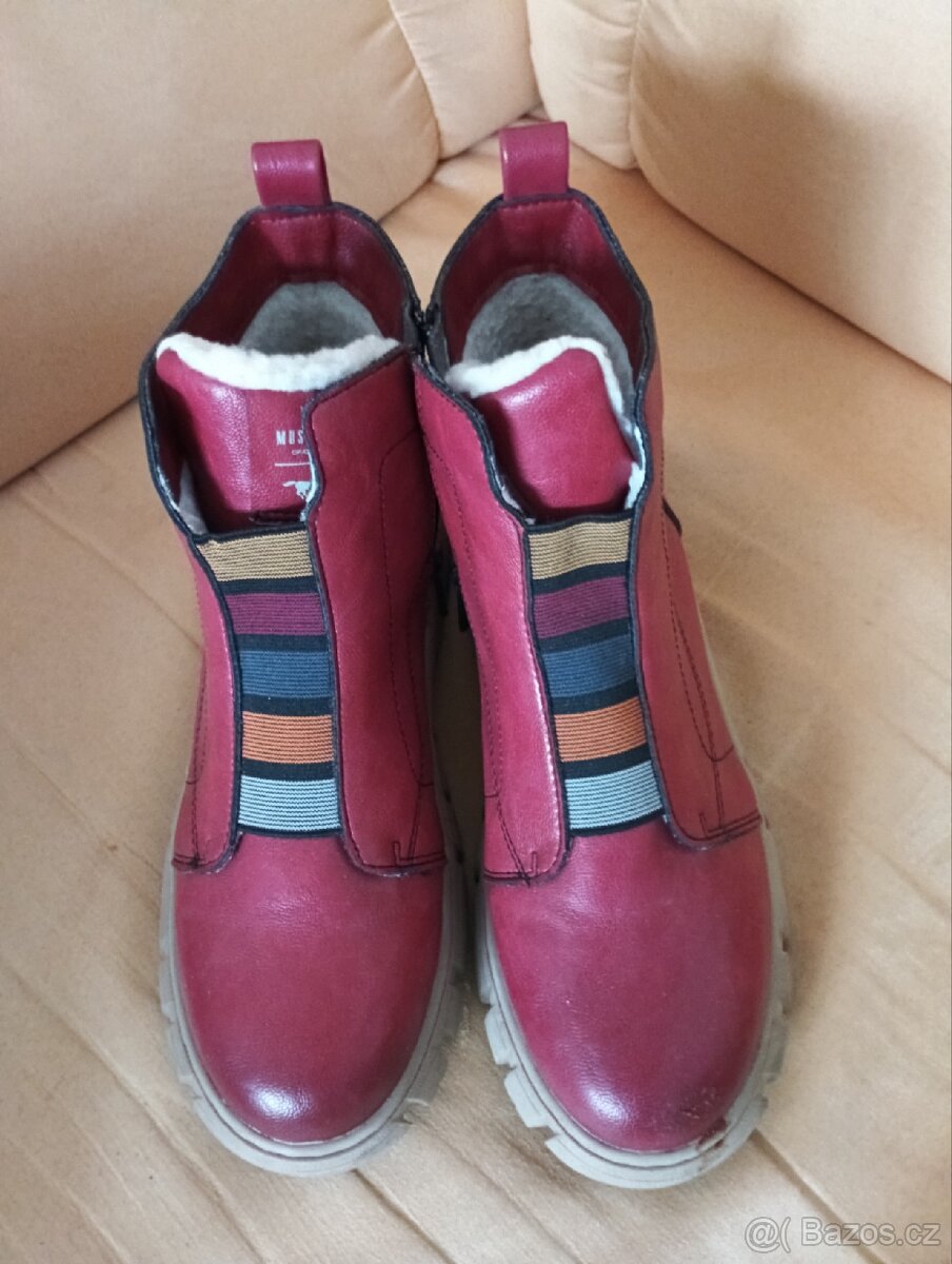 Prodám dámské měsíc nošené kotníkové boty s beránkem na zip, značka MUSTANG.Velikost 39.Vyska podrážky 5 cm, celková výška bot 15 cm.PC.-1269kc, nyní 500kc.Predani na Praze 4 Spořilov nebo metro Roztyly.