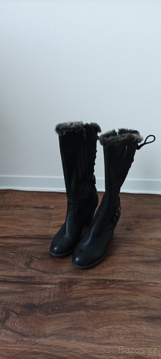 zn.Tamaris, vel. 39, černá kůže + semiš, výška holeně 30cm, podpatek 8cm, podrážka 1,5cm