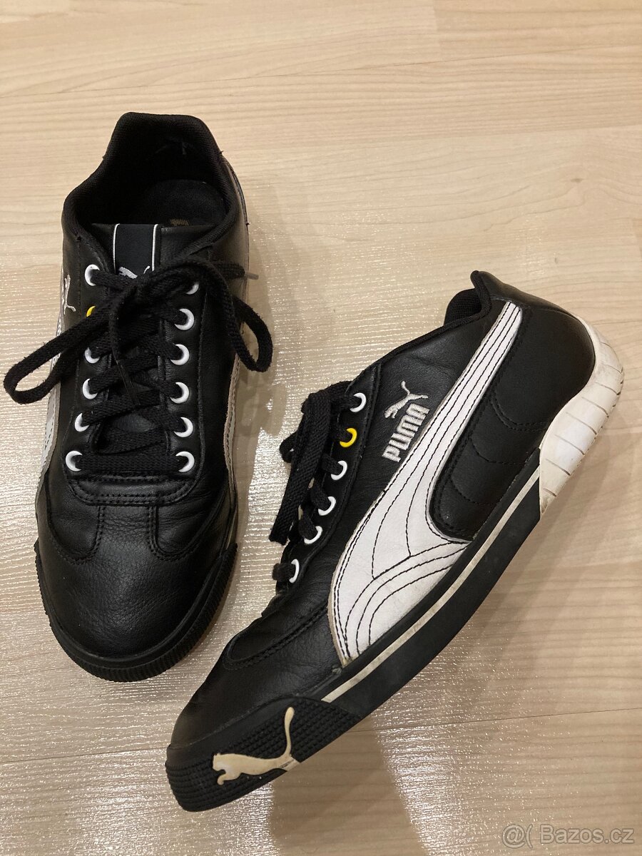 Boty - tenisky Puma, kupované v UK, kožené, hezký nošený stav, jen na vnitřní straně paty prošoupaná látka. Nejsou okopané. Detailní foto viz fotografie.