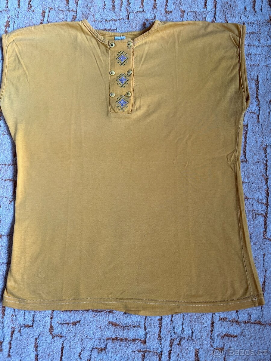 Triko 100% bavlna,spadlé jemně přes ramena, na štíhlou postavu 165 cm vysokou. Ozdoba u krku je vyšívaná. Triko není vyšisované, ač to tak na fotografii vypadá. Je to výrazně okrová barva. Výborný stav.