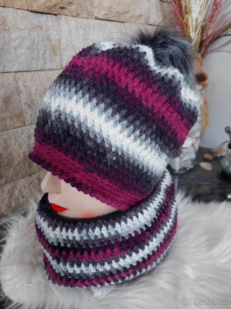 Háčkovaný set, čepice s odepínací bambulí, šálový tunel dlouhý 120 cm.