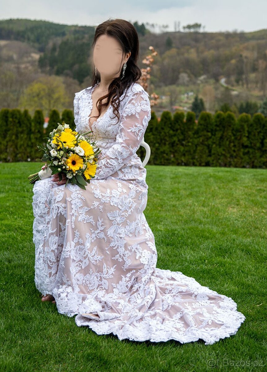 Prodám svatební šaty - zakázková práce – jediný model. Velikost cca 36-38, výška do 170 cm, vlečka 50 cm.