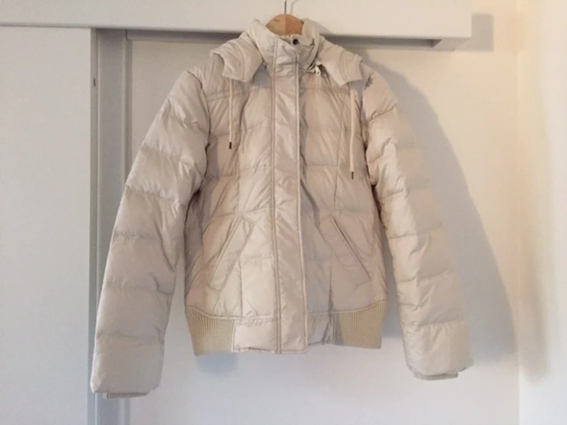 NOVÁ dámská péřová bunda Jackpot (bez visačky). Velikost psaná M. Bude i těm, co nosí S. Šířka v podpaží 50 cm, délka 60 cm. Krémová barva. Odepínací kapuce. Na rukávech, kolem krku a částečně v pase jsou úplety. Na zádech lze zúžit - viz foto.