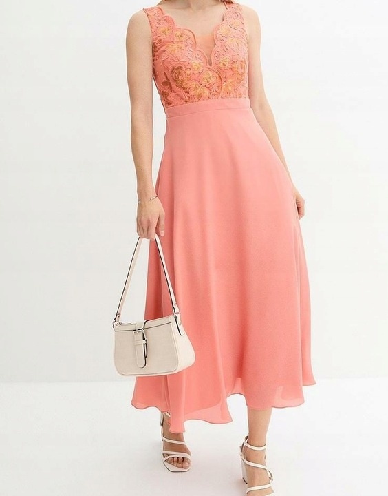 Nové zn. Bonprix vel. 44. Délka 134 cm, prsa 2 x 55 cm v klidu, povolí 2 x 62 cm, nad pasem 2 x 49-56 cm. Vzadu hodně pružné žabičkování, barva světle meruňková, mají spodničku. Na různé plesy a jiné společenské akce. Osobně nebo balíkovnou, zásilkovnou.