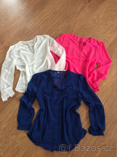 Nová. Na výběr 3 barvy:smetanová, modrá a růžová. Dlouhý rukáv, lze zkrátit pomocí knoflíku. Spodek halenky je do oblouku. Halenka je vypasovaná, vzadu jsou 3 knoflíčky na ozdobu. Smetanová: velikost L, délka 61,5 cm, zadní díl 67,5 cm průramky 48 cm, rukáv od kapuce 69 cm. Modrá: velikost XL, délka 64 cm, zadní díl 72 cm průramky 49,5 cm, rukáv od kapuce 70 cm. Růžová: velikost L, délka 62 cm, zadní díl 68 cm průramky 49 cm, rukáv od kapuce 68 cm.