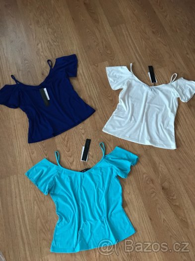 Nové včetně cedulek. Na výběr tři barvy:sv. modrá, tm. modrá a smetanové bílá. Sv. modrá:velikost L, délka 56,5 cm, průramky 46,5 cm. Tm. modrá: velikost M, délka 55 cm, průramky 45 cm. Smetanově bílá: velikost M, délka 56 cm, průramky 44 cm.