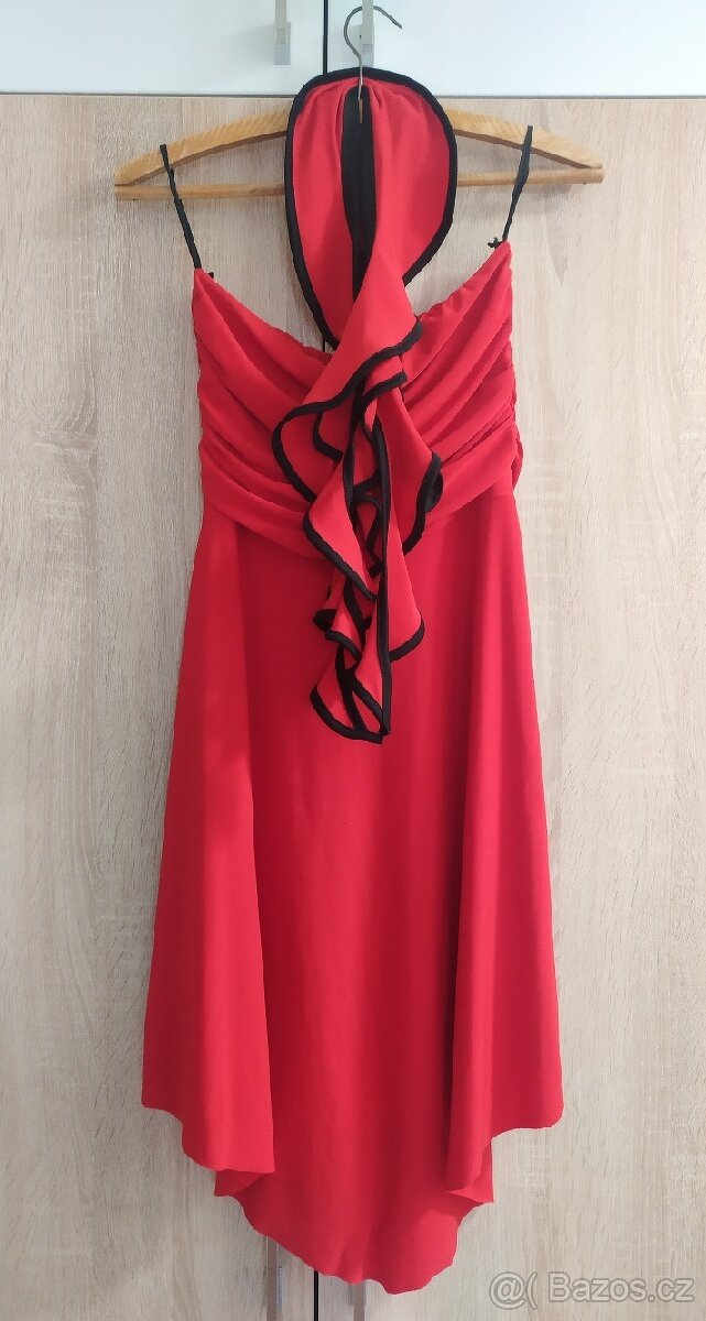 Nabízím červené šaty vhodné na ples se všitým ozdobným detailem,který se obléká přes krk. Ve velikosti S/M, M. Délka šatů je 83 cm.