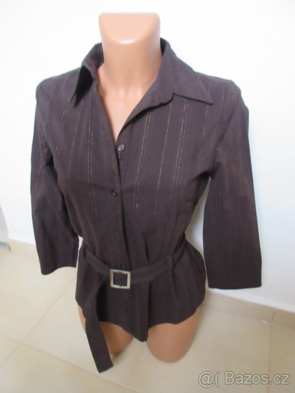 Dámská halenka CaA tmavě hnědé barvy s dlouhým rukávem o velikosti 38. Klasický límeček, zapínání na 7 knoflíků, měděná lurexová nit, pásek na přepásání v pase s kovovou sponou. Cena 48 Kč. Zasílám pouze poštou, osobní odběr není možný. Cena poštovného při platbě předem 60 Kč, při zaslání na dobírku 130 Kč.