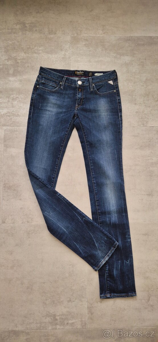 Dámské džíny Replay, velikost 28/34. Pas: 74cm, sed: 22/27cm, obvod stehna: 43-44cm, délka: 105cm. Zadní kapsy na zip. Materiál 98% bavlna, 2% elastan.