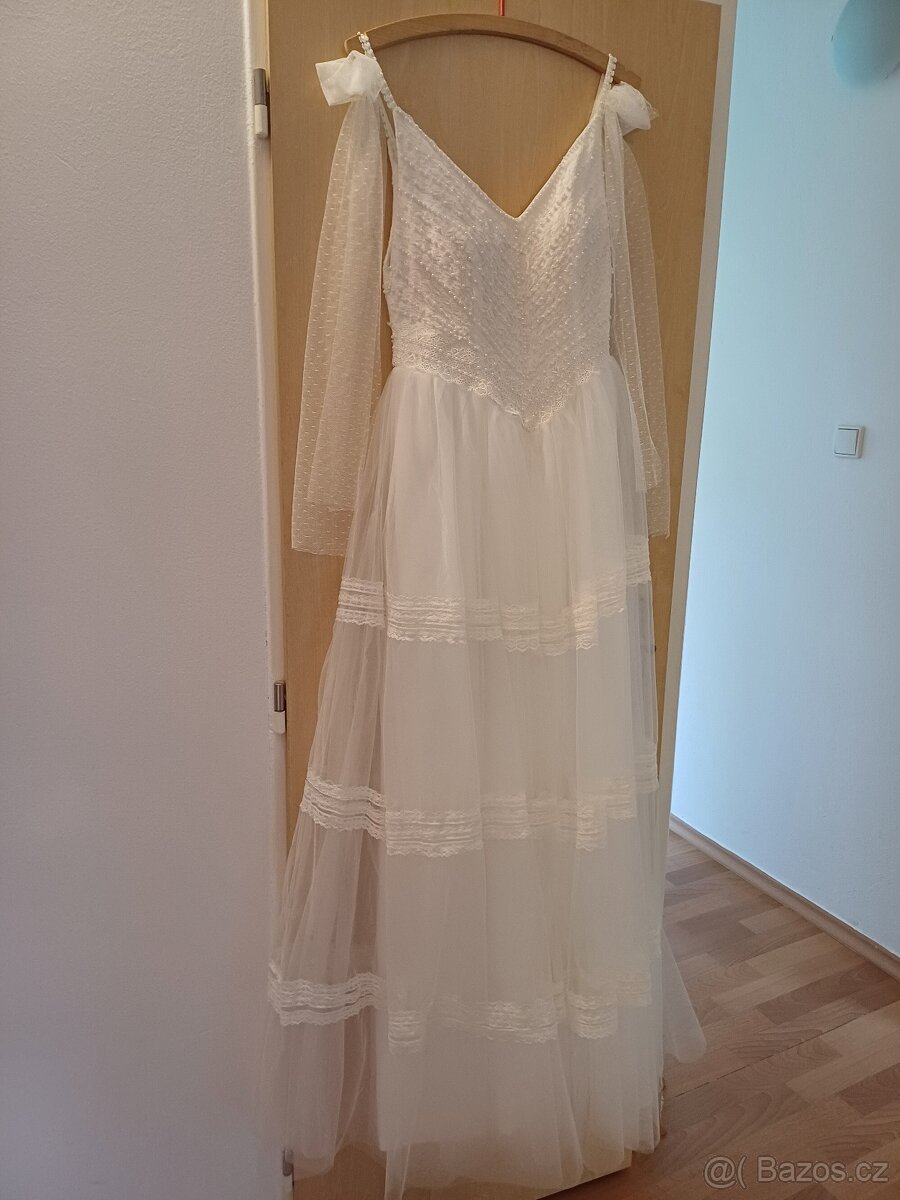 Krásné bílé, boho svatební šaty. Vzadu na zip (praktické, lze přetáhnout přes boky, pokud je nevěsta již učesaná). Velmi pohodlné, žádný korzet. Mašličky vzadu na ramenou (lze odpárat případně), vrchní díl a ramínka pošity korálkami. Jsou zúžené na mou postavu, lze v případě potřeby opět povolit (vypárat). Lze i jednoduše zkrátit, tyl není začištěn, stačí ustřihnout (také jsem lehce zkracovala).