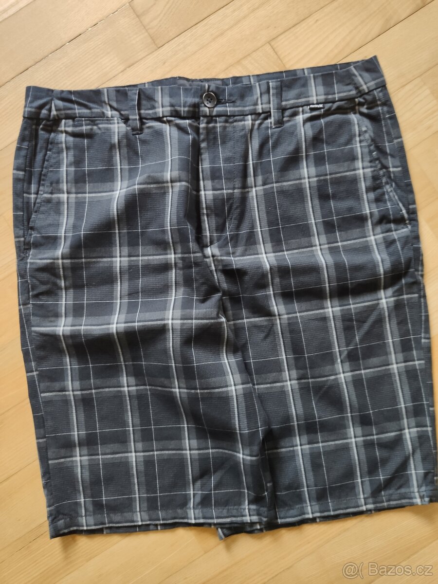 Minimálně nošené , krásně vypracované Hurley kraťasy. Příjemná bavlna - plátno ideální na léto. Vpředu dvě boční kapsy, vzadu jedna s klopou, druhá na knoflik dovnitř. Nad kapsou logo značky, taktéž malé logo dole na levé noze. . Černošedá kostka. Výrazné barvy, neoprané. Zakoupeno v zahraničí. Rozměry pas 44 cm, boky 55, celková délka 55, šíře stehen 34, rozkrok 34, šíře nohavic dole 26 cm. Osobní odběr v Praze 6 jinak zasilkovna za 70 Kč