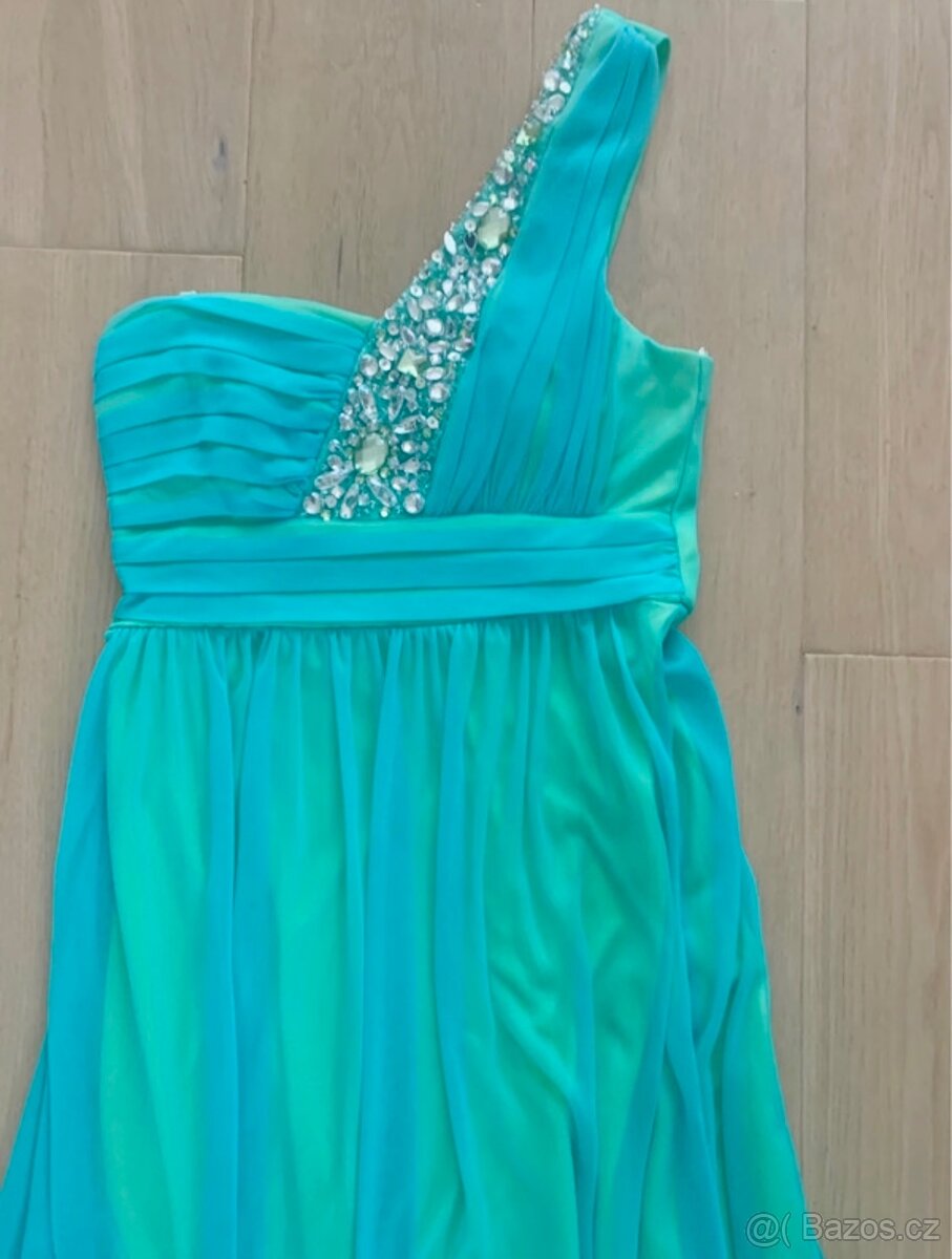 Krásné tyrkysové se žlutou podšívkou, focené na postavě M. Zn. City Triangles. Zdobené kamínky, které jsou trochu ošoupané, viz foto, ale vcelku to není poznat.