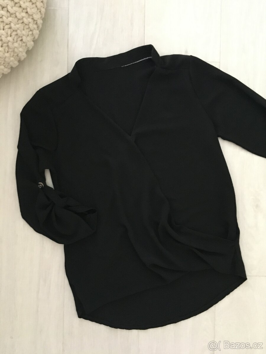 Černá halenka se zavinutým vzhledem (pro lepší názor je to vidět na mint halence), zadní část je prodloužená.