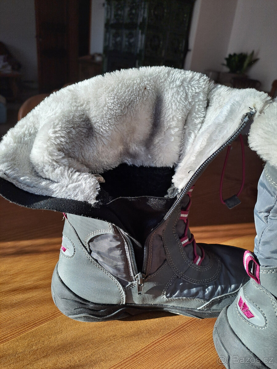 Prodám krásné, velice teplé kozačky. Dcera nosila loňskou sezonu, kožich uvnitř celé boty-v krásném stavu, viz foto. Jsou voděodolné. Mají reflexní prvky.Původní cena 1200,- kč.