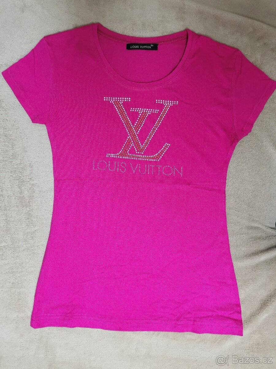 Prodám tričko LV, velikost XS, rozměry viz. fotografie, barva růžová sytá, nápis z kamínků, elastické - pružné, téměř nové.