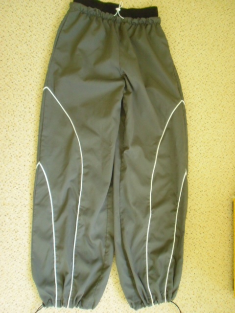Šedé šusťákové kalhoty se zvýšeným pružným pasem vel. S, boční délka od pasu 100 cm, 100% polyester, výborný stav, bez vady, vhodné na moderní tance. Cena 90 Kč. Poštovné 75 Kč.
