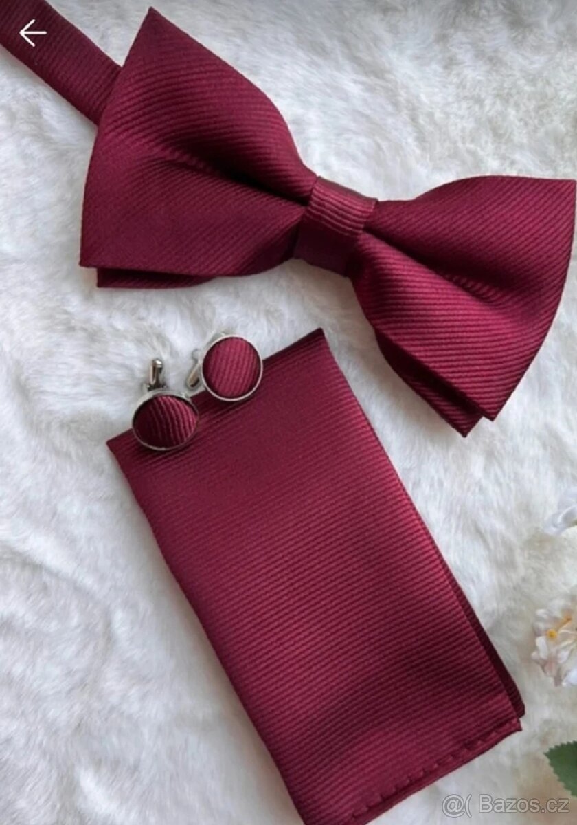 Komplet motýlek, kapesníček, manžetové knoflíčky.