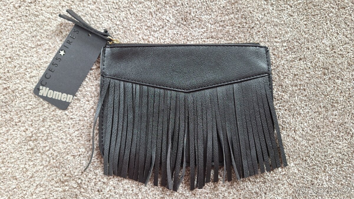 Prodám černou kosmetickou taštičku s třásněmi značka ACCESSOIRES WOMEN (New Yorker), rozměry: délka: 20 cm, šířka 14 cm, materiál: koženka, viz foto. NOVÁ, NEPOUŽITÁ. Cena 85 Kč.