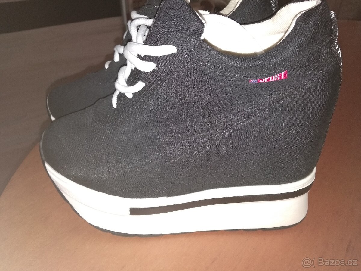 Prodám boty (jaro,léto,podzim)černá/bílá tkanina,pryž ,vysoké část klínek,šněrování ,velikost 39 ...délka stélky 24,5 cm díky klínku sedí na velikost 37/38 nové nenošené!