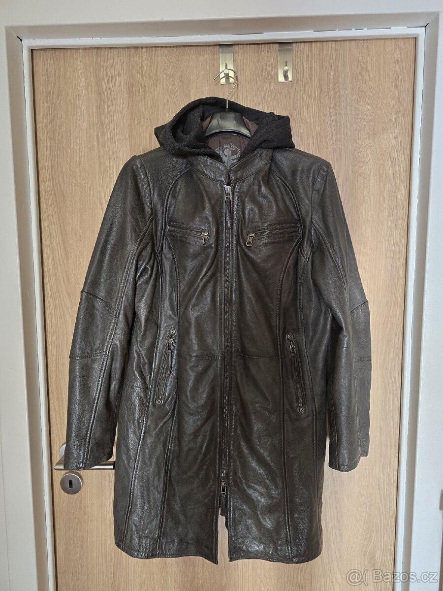 Bez vad. Dámský kožený kabát z pravé kůže Gipsy. Vhodný na podzim, mírnou zimu, jaro. S podšívkou. Kapuce se dá odepnout a nosit bez kapuce. Délka 85 cm, šířka přes prsa 56 - 59 cm, pas 51 - 54 cm, rukáv od ramene 63 cm, rukáv od průramku 46 cm, šířka v ramenou 45 cm.