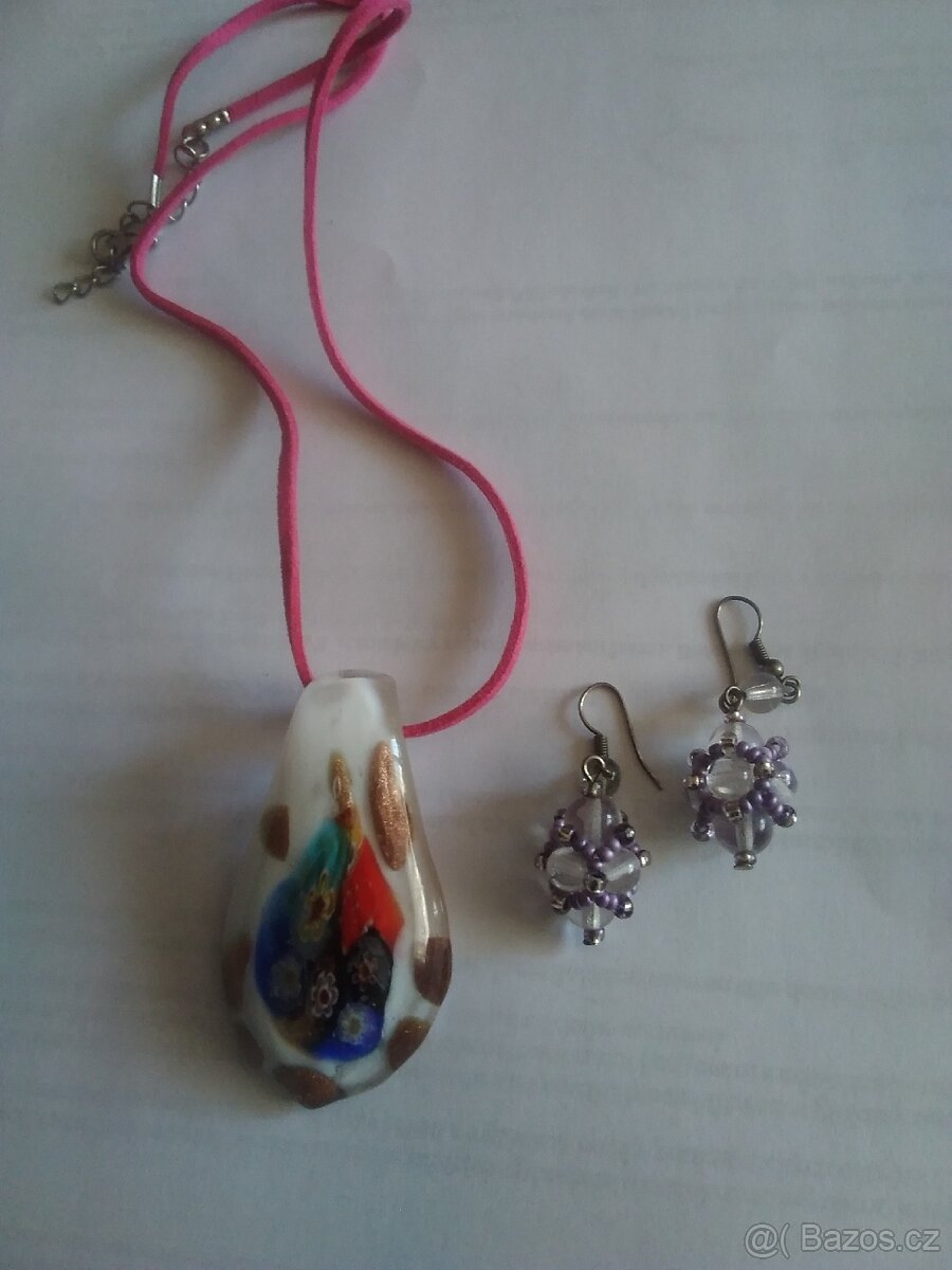 Ruční práce,sklo a ruční malba přívěsek 6x3,5 cm náušnice sklo a skleněné korálky průměr 2cm.Poslu zásilkovnou balikovnou nebo PPL.