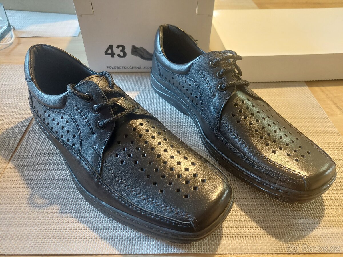 Prodám letní polobotky vel.43 do práce, na bál i do truhly. Zcela nové. Pracovní , černé , Při koupi více kusů sleva.