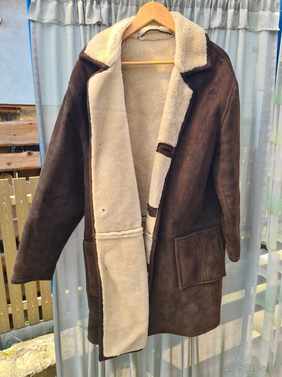 Semišový kožich (pravá kůže) s pravým beránkem uvnitř. Rovný sportovní střih ke kolenům. Nenošený, ale má kosmetickou vadu.. dvě pidi dirky na spodní straně rukávu a chybí spodní knoflík - viz fotky.