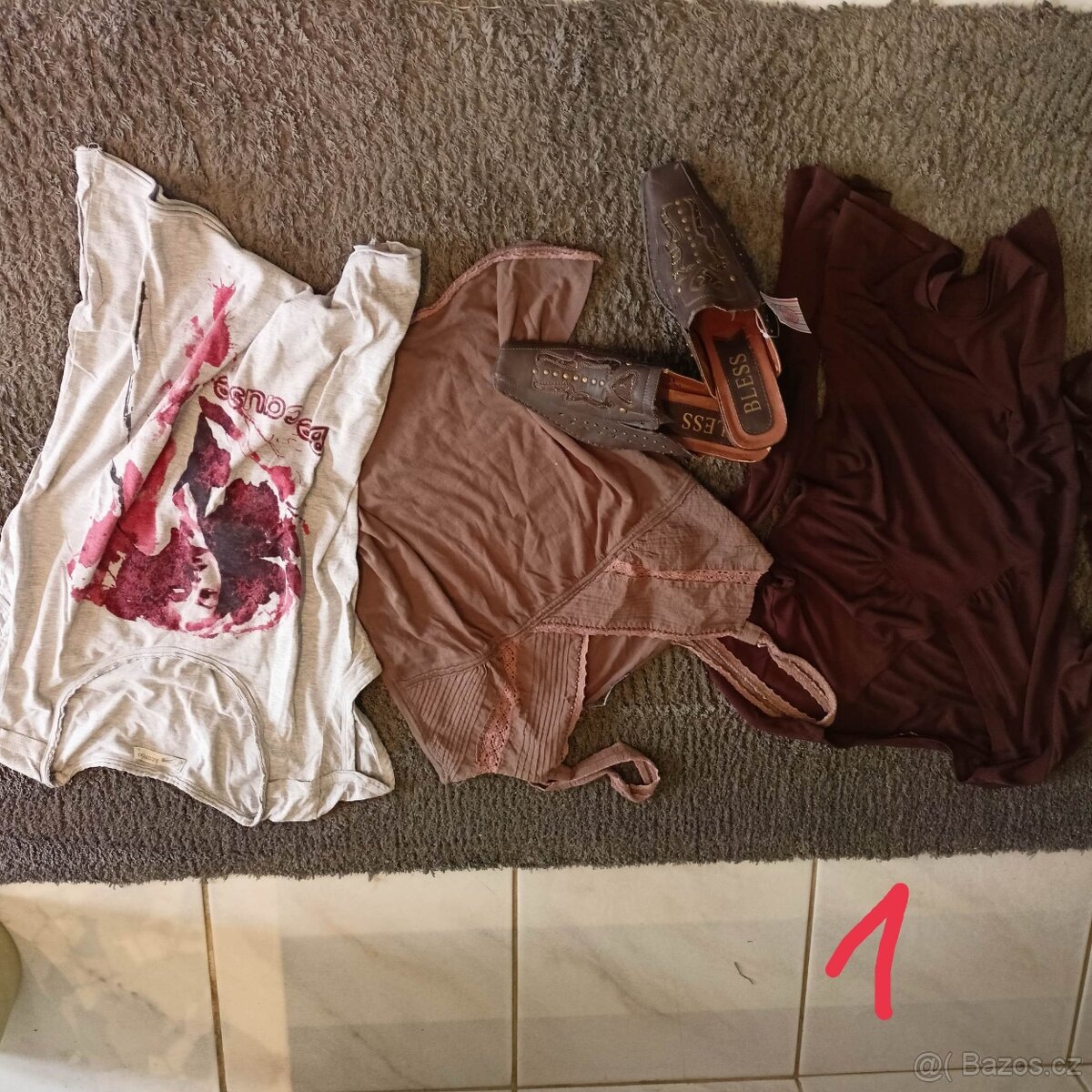 Nošené, jedno tričko má zašitou dírku, jedny legíny světle flíčky, ještě určitě poslouží. Cena za celek 120 Kč.