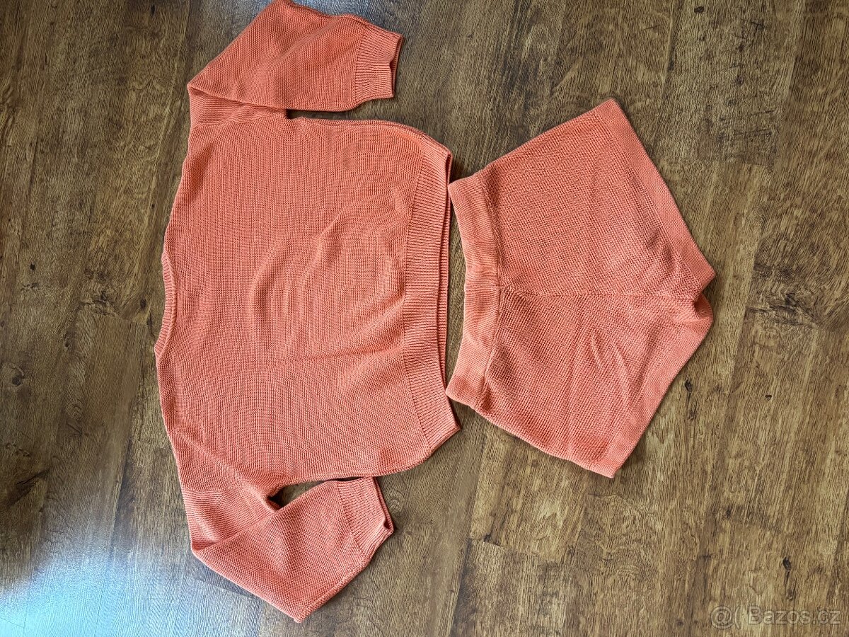 Prodám dámský oranžový komplet značky a lot less, 100% bavlna, úplet. Nošený, bez vad. Spodní díl velikost XS, pas 34, délka přední díl 27 cm, zadní díl 33 cm. Vrchní díl, volný střih, uvedená velikost S. Délka 50 cm, šířka 59 cm, délka rukávu měřená od krku 67 cm.