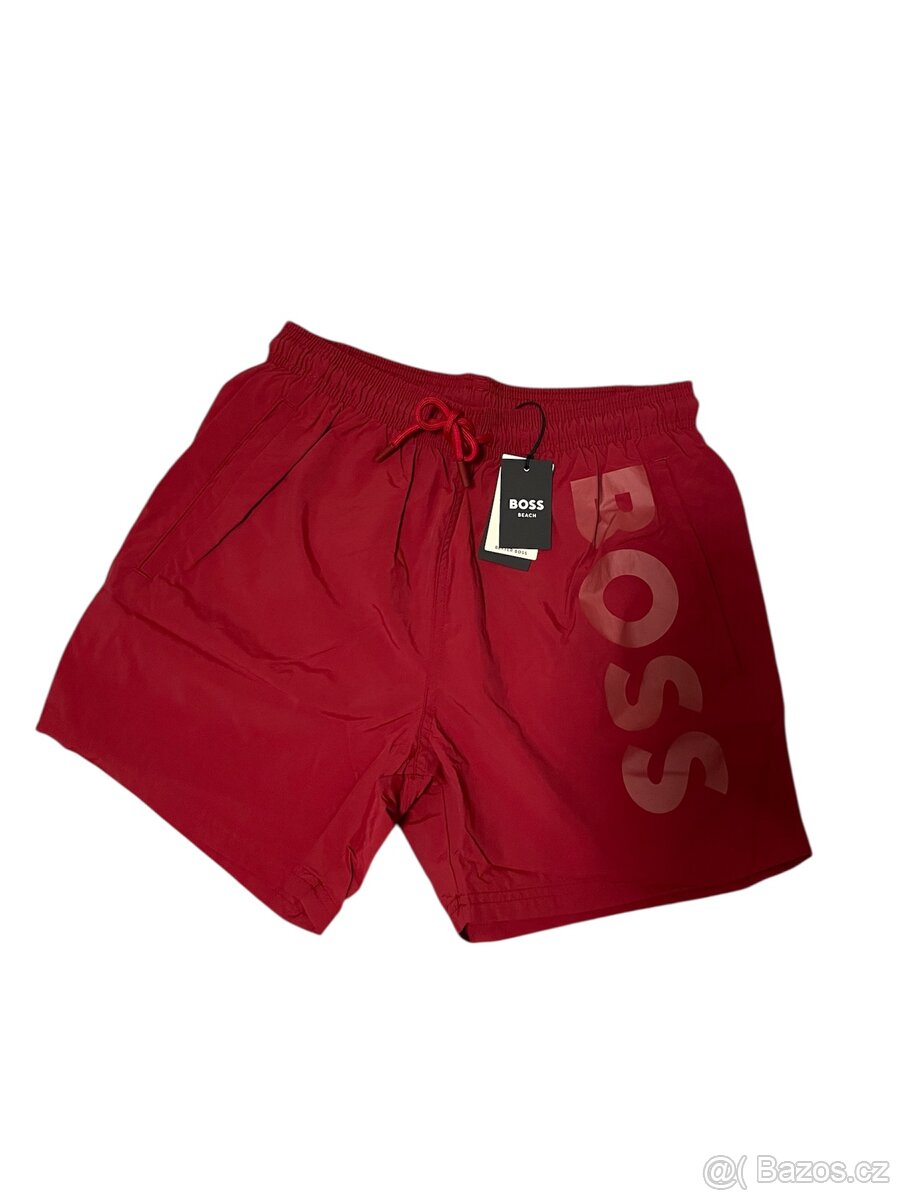 Stylové plavky od značky BOSS v výrazné červené barvě s ikonickým logem na boku.