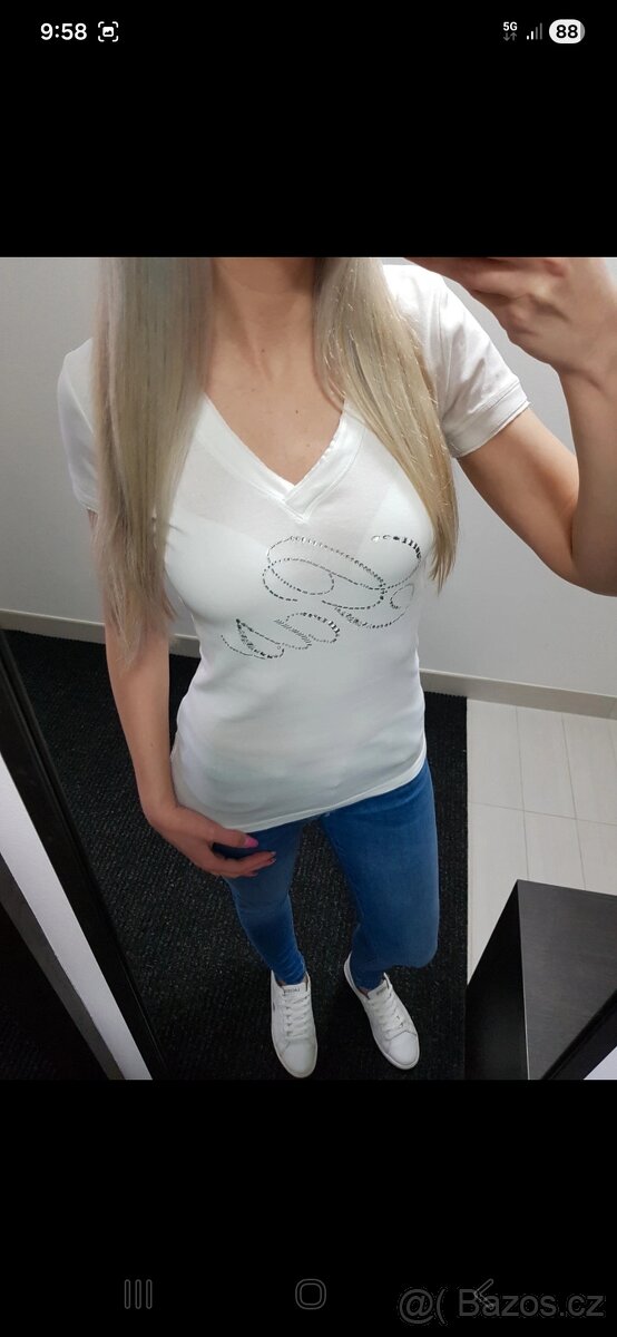 Bile tricko znacky Gas, jednou oblecene, uplne jako nove, zarive bile, stribrne kaminky, zadny nechybi. Velikost M, padne i na S, pruzny material. Postovne, balikovna nebo zasilkovna 79Kc.