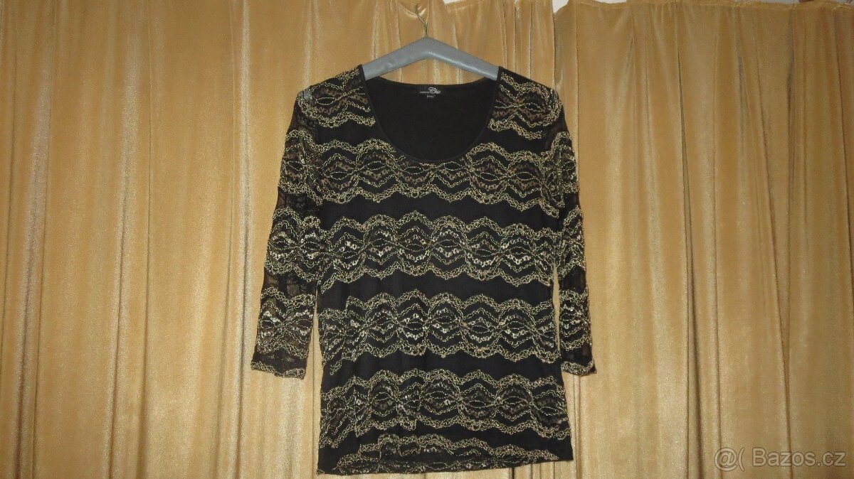 Prodám novou černou společenskou tuniku zdobenou zlatou krajkou, 3/4 rukávy, perfektně sedí. Velikost 42.