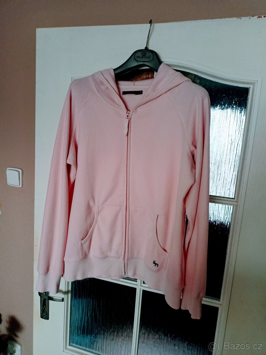 Světle růžová mikina,bez závad.Míry:průramky 60cm,pás 53cm,délka 66cm,rukáv i s manžetou 73cm.Je slabší flísová,cena 190 korun + poštovné