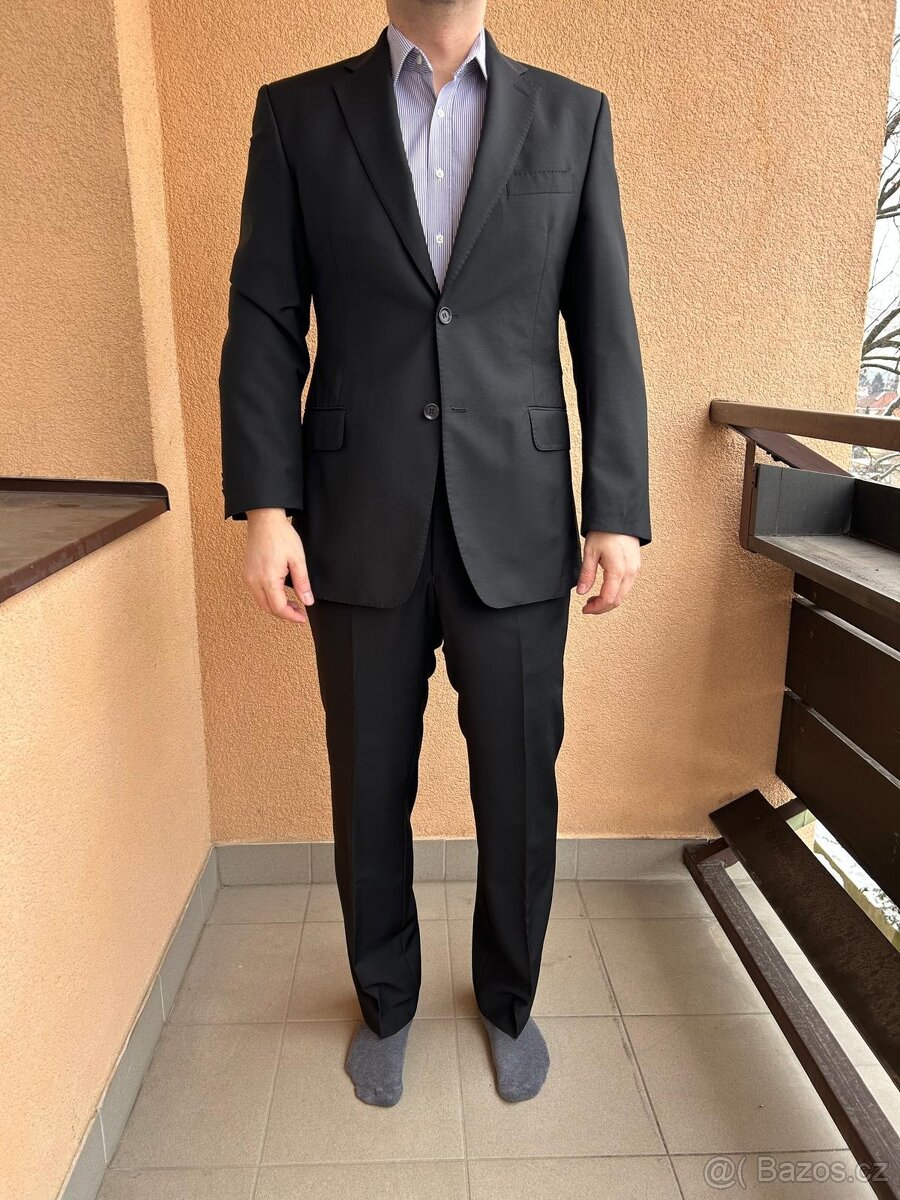 Pánský oblek BLAŽEK - [2.2. 2026]Prodám kvalitní pánský oblek zn. Blažek, lehký tmavý/černý s jemným proužkem, na vyšší štíhlou postavu 184 cm/80 kg.