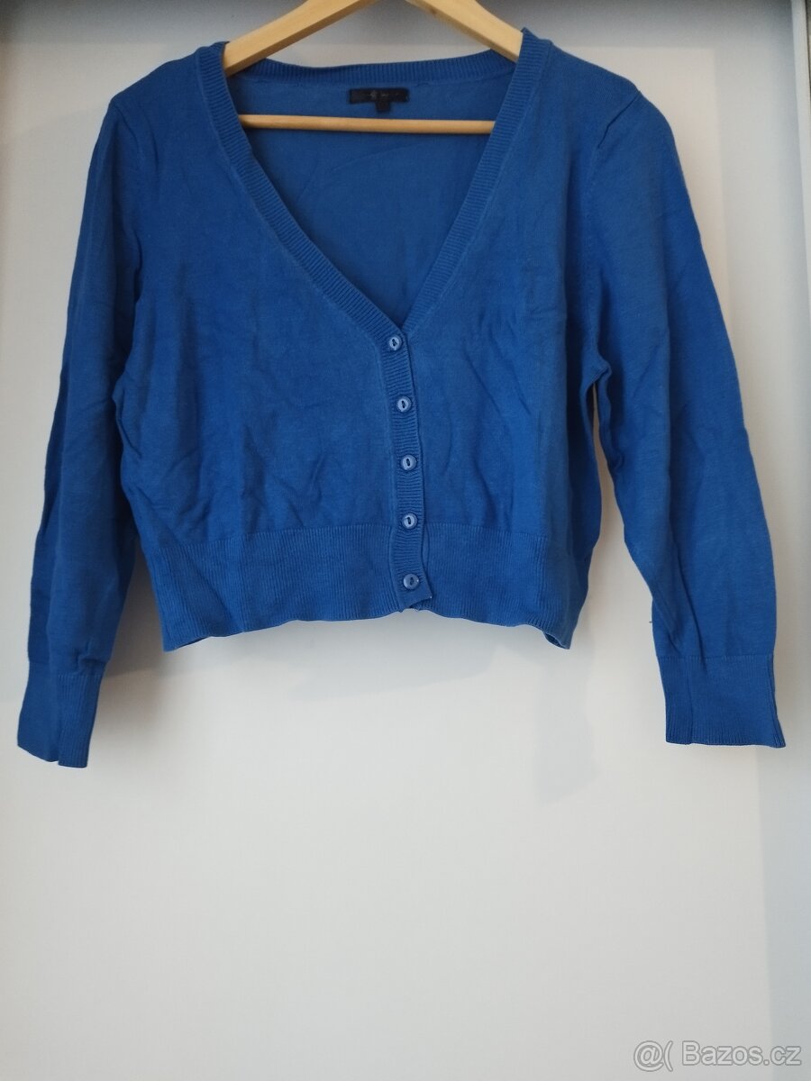 Svetrové bolerko s dlouhým rukávem. Bolerko je královsky modré barvy a je na knoflíčky. Velikost je M. Délka je 45 cm.