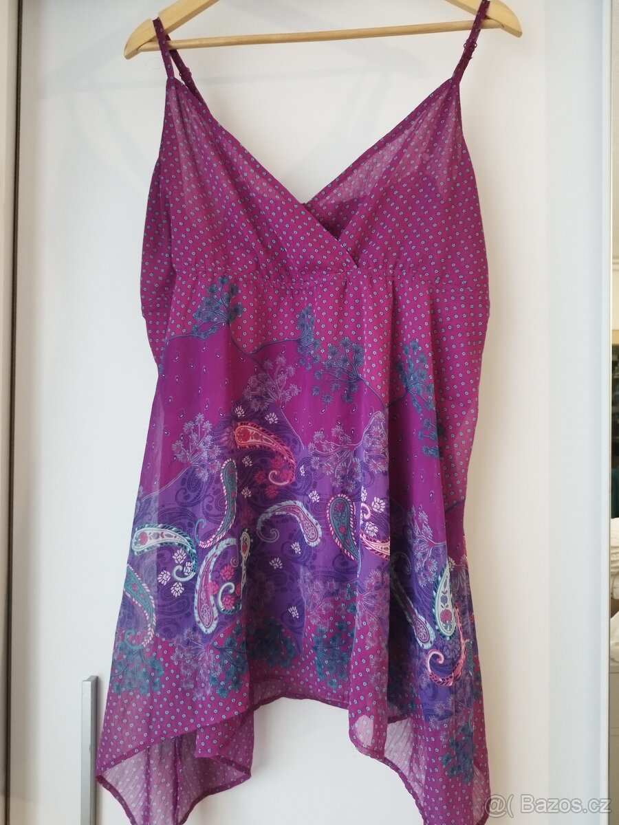 Růžová tunika, která je zajímavá svým střihem. Tunika má boky delší - 81 cm. Zároveň má krásný fialový vzor. Tunika je na ramínka a má i spodničku viz poslední fotka.