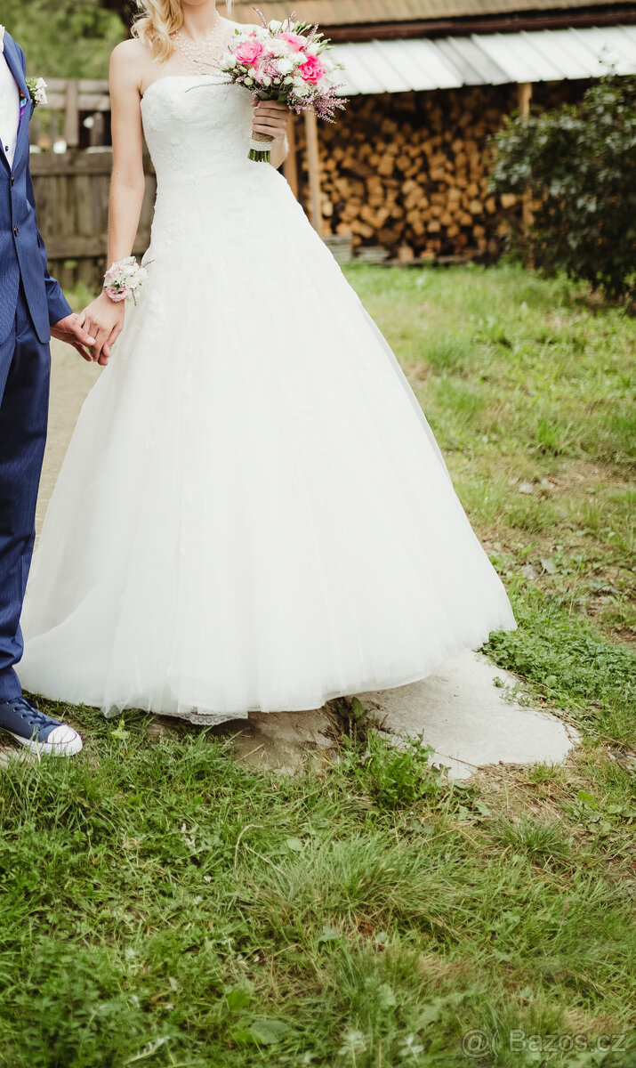 Prodám svatební šaty Pronovias Barroco. Velikostně odpovídají 36-38. Jsou na výšku postavy 170-175 cm dle podpadků. Vlečka se dá zkrátit připnutím knoflíčku k šatům. Jsou vyčištěné, švadlenkou zapravená vnitřní vrstva, která byla lehce proděravěná od podpatků – z venku není vidět.